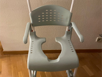 Silla de baño con reposapiés, reposabrazos y con ruedas. Perfecta para duchas y transporte en el domicilio.